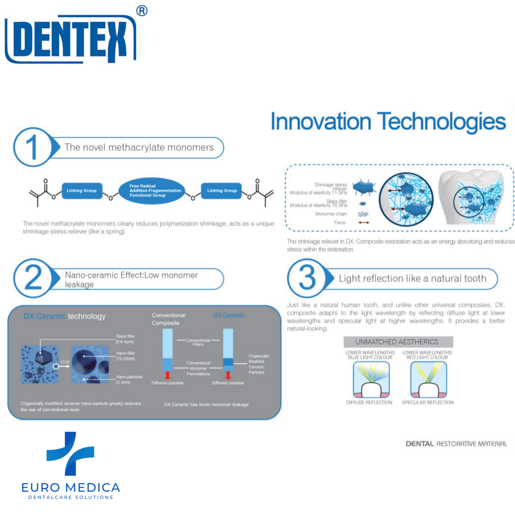 DX Universal is a universal, high-performance , nano ceramic and low monomer leakage composite, designed for restorative dentistry. It is engineered to provide excellent handling, durability, and esthetics for a wide range of direct and indirect restorations. With it's advanced nanohybrid formulation, DX Universal ensures superior strength, easy sculptability, and a natural tooth-like appearance. It's strong points are as follows: